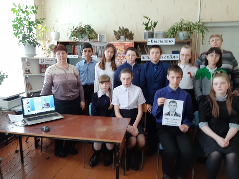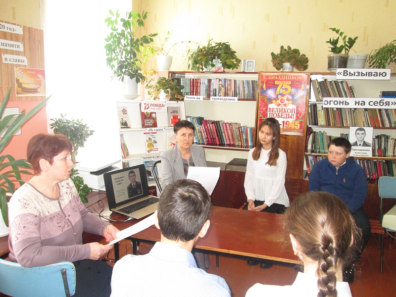 13 марта 2020 года культработники совместно с библиотекой подготовили и провели патриотический час памяти в сопровождении презентацией «Вызываю огонь на себя» для учащихся. Ребята узнали о жизни и подвиге Героя России А. Прохоренко, была затронута тема локальных войн современности, а так же оформлена книжная выставка «Не гаснет памяти свеча». Ведущие подчеркнули, что память о Герое живёт в памятниках, бюстах, названиях улиц и скверов, стихах и песнях. Была объявлена минута молчания в честь героя. В память об Александре прозвучали проникновенные строки стихотворения Бахтиера  Ирмухамедова. Много эмоций вызвал у ребят видеоролик, снятый на песню С. Тимошенко «Я вернусь», посвящённую подвигу А. Прохоренко. В завершении, как наказ, прозвучали слова: «Нельзя научиться любить живых, если не умеешь хранить память о павших…» Присутствовало 14 человек из них 10  детей.